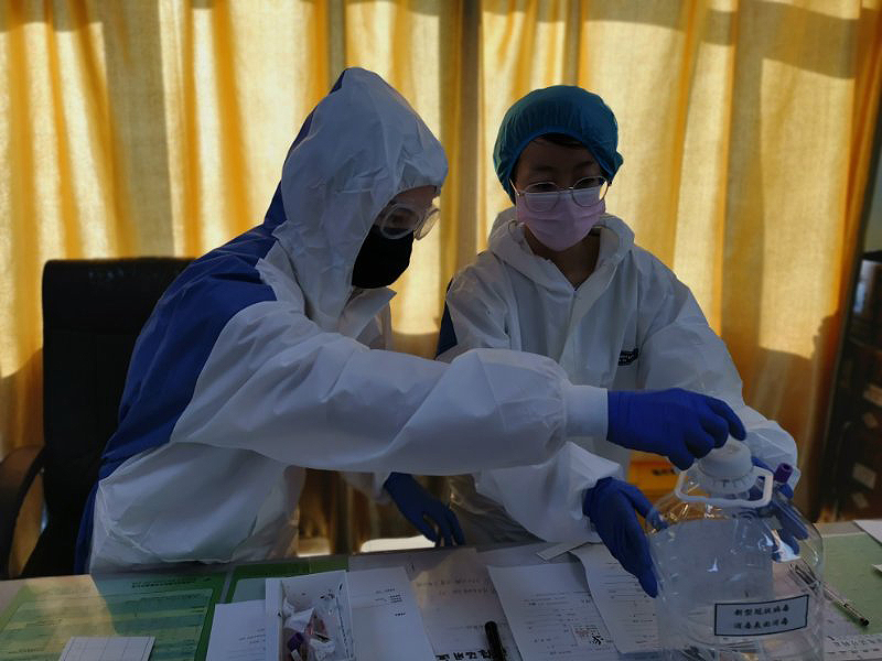 上图:输血科柳丹丹克服困难支援中心实验室